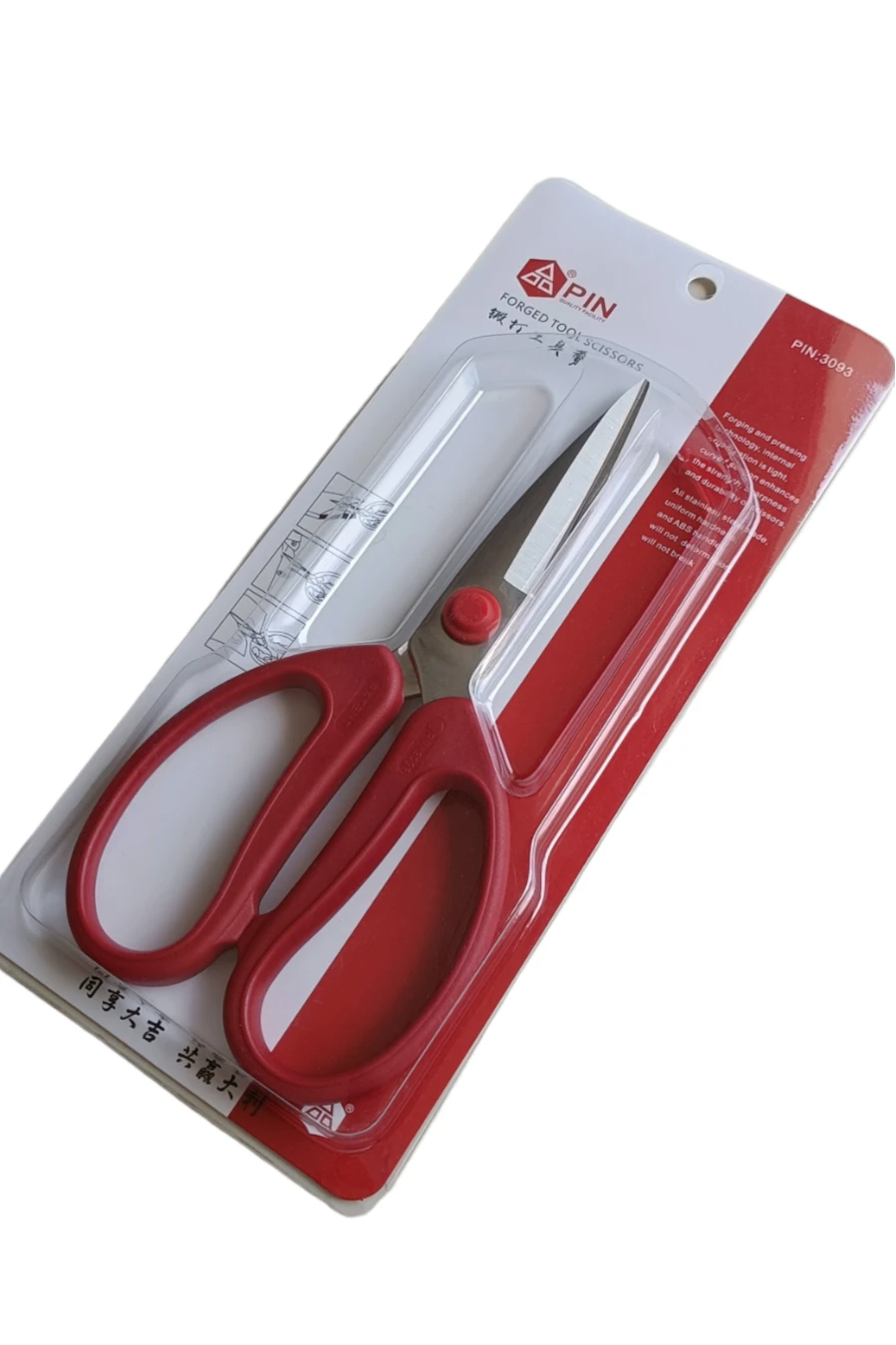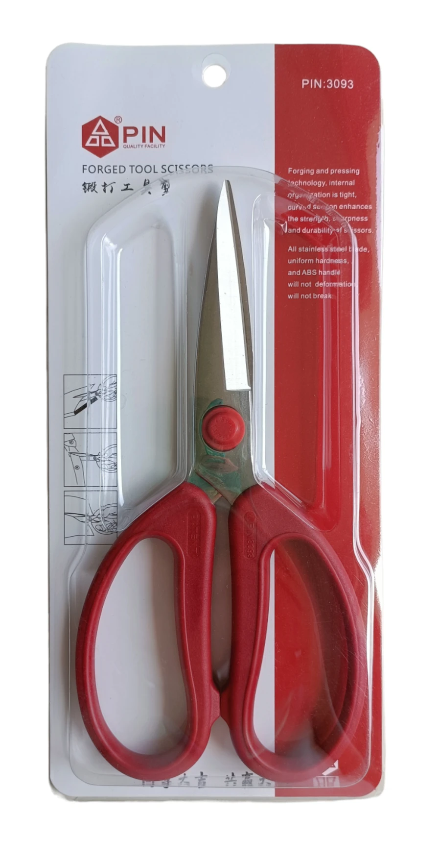 PIN Forged Tool Scissors 3093 , Forging and pressing technology , Internal organization is tight , Curved section enhances the strenght , Sharpness and durability of scissors , All stainless steel blade , Uniform hardness and ABS handle will not deformation , Will not break